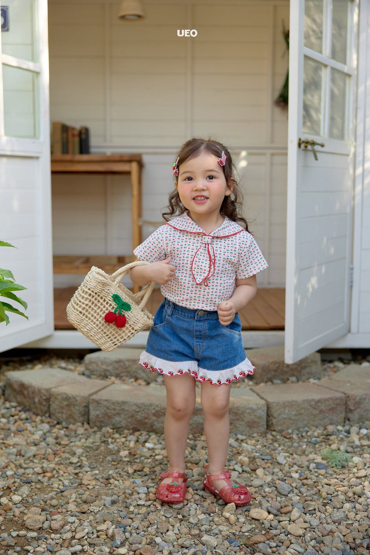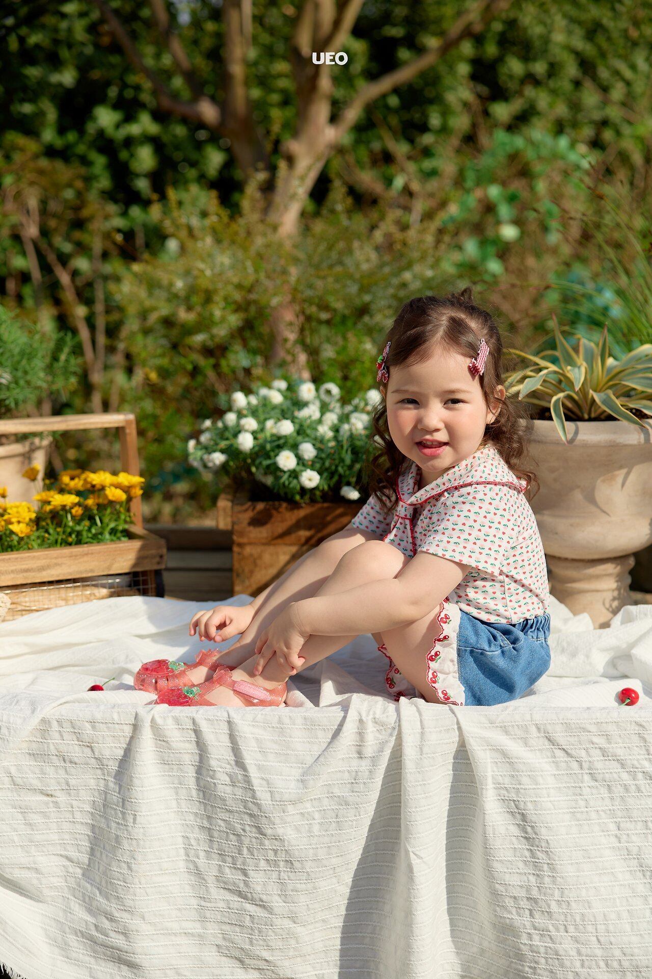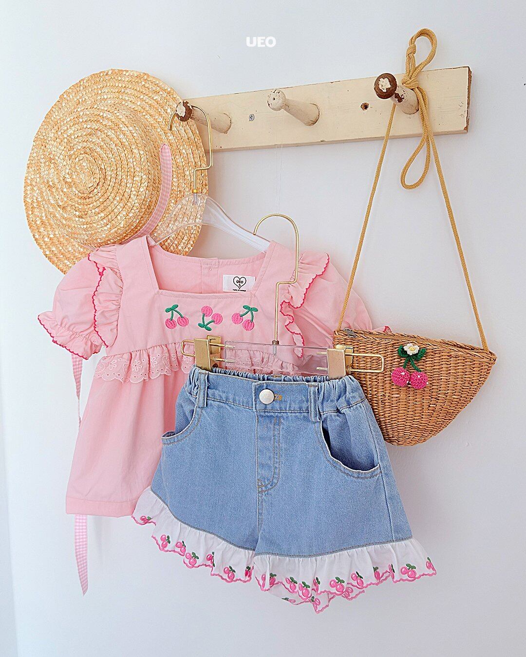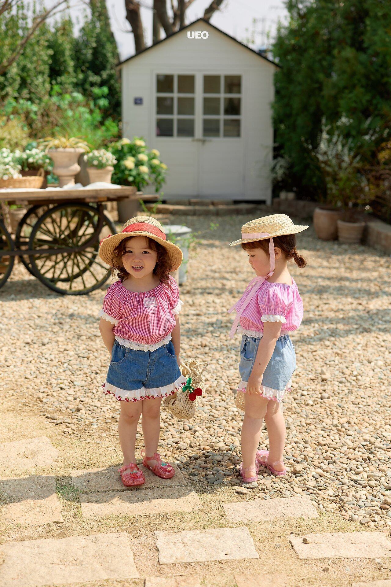 韓国子供服 UEO こどもふく 女の子 夏服 お出かけコーデ かわいい おしゃれ チェック ふりふり トップス パンツ お揃い キャップ