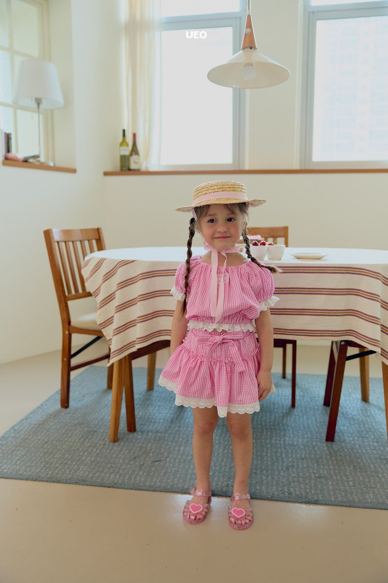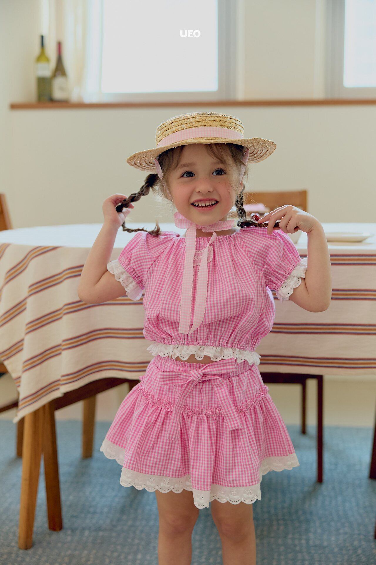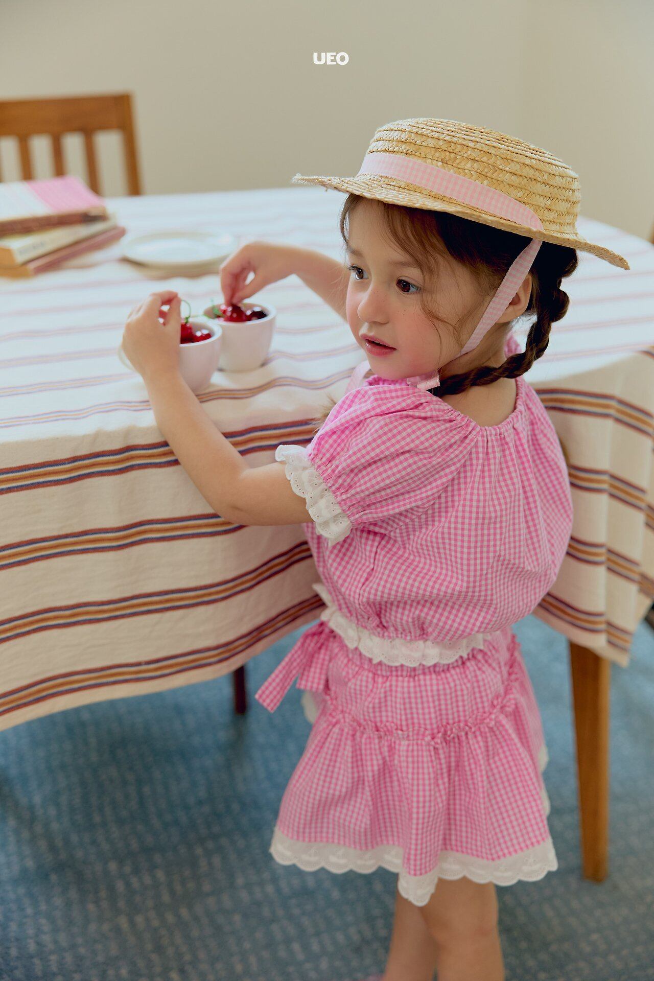 韓国子供服 UEO こどもふく 女の子 夏服 お出かけコーデ かわいい おしゃれ チェック ふりふり トップス パンツ お揃い キャップ