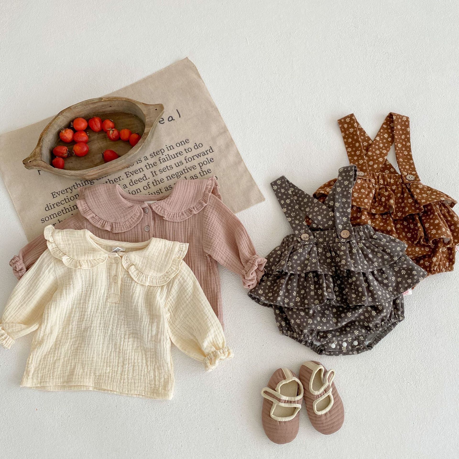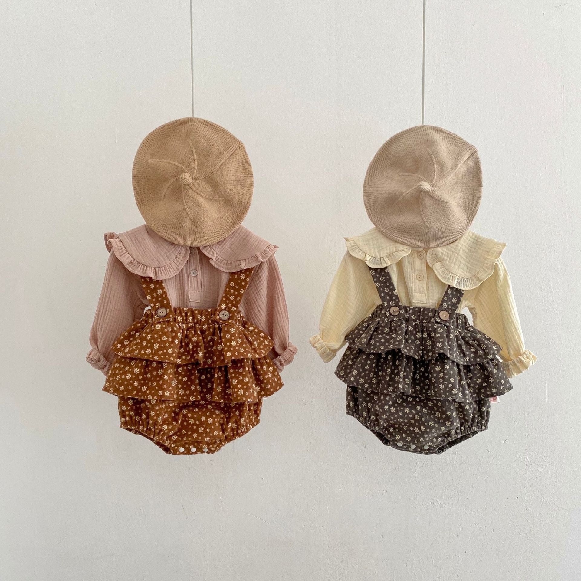 ベビー服 子供服 おしゃれ かわいい プチプラ 女の子 ブルマ サロペット ブラウン ピンク ホワイト アイボリー ブラック 花柄 花 トップス セットアップ ブラウス
