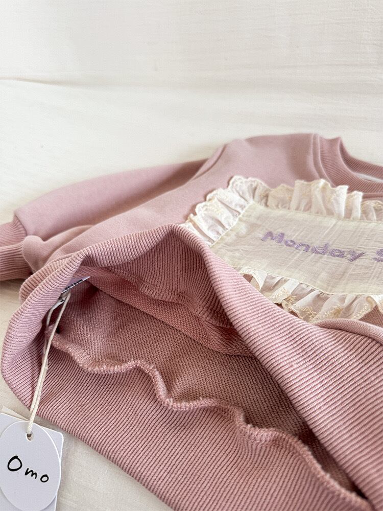 子供服 こどもふく おしゃれ お揃い オソロ リンク リンクコーデ 姉妹 姉妹コーデ かわいい プチプラ 女の子 アイボリー ホワイト 韓国子供服 韓国服 ピンク レース トレーナー ブルー フリル ロゴ