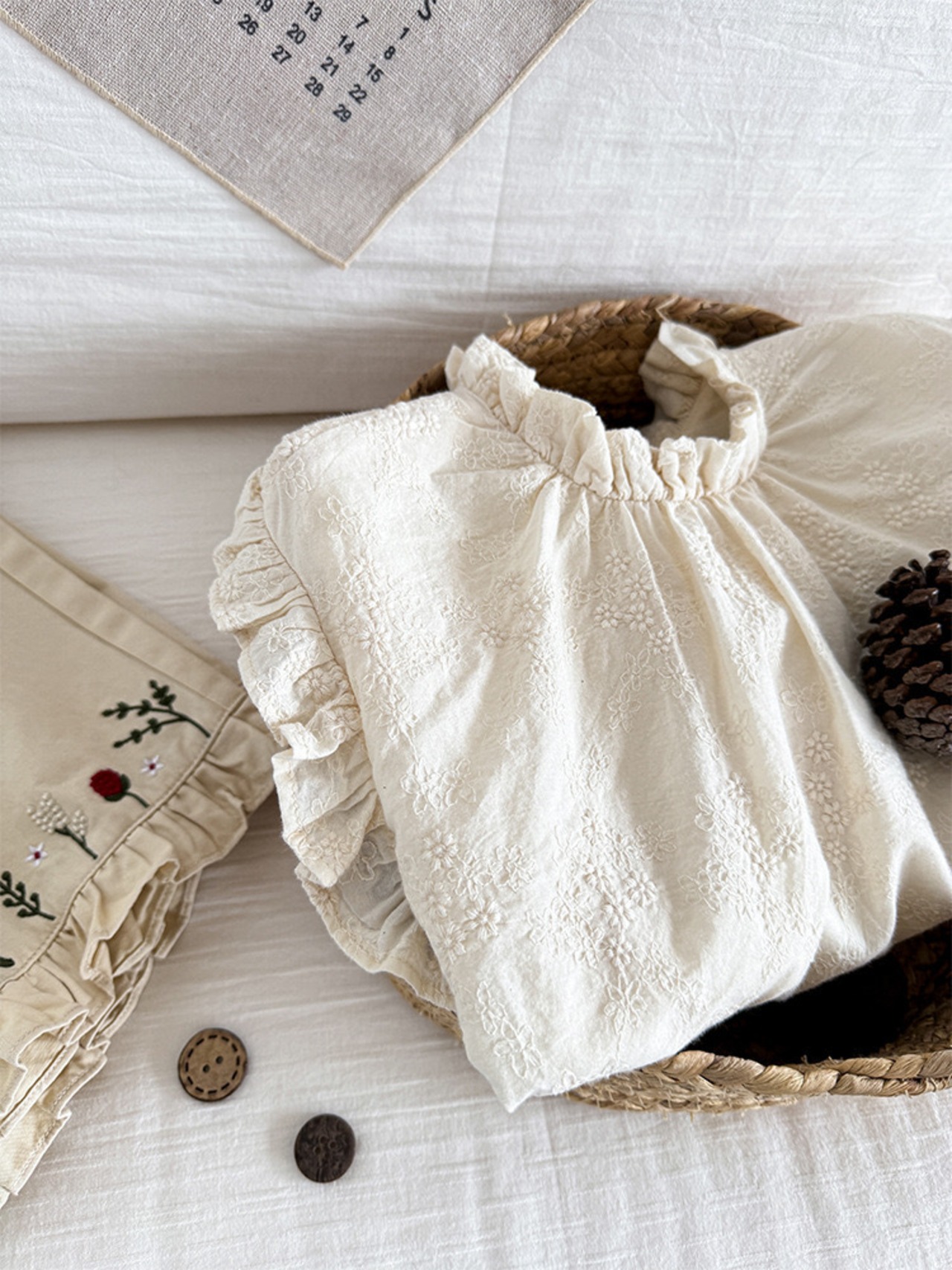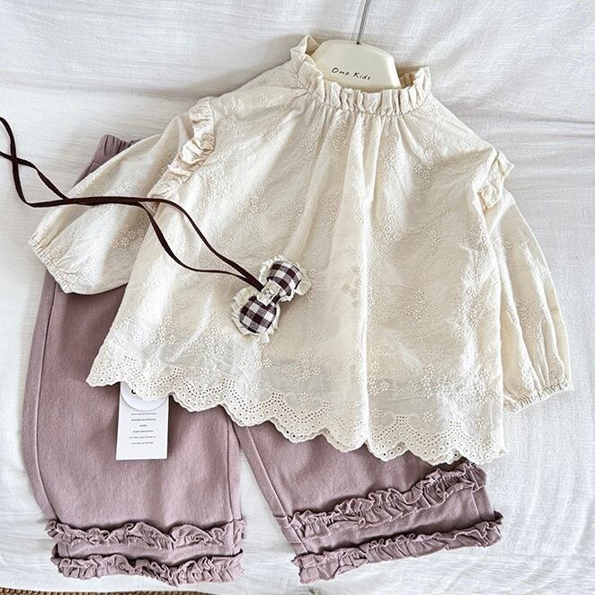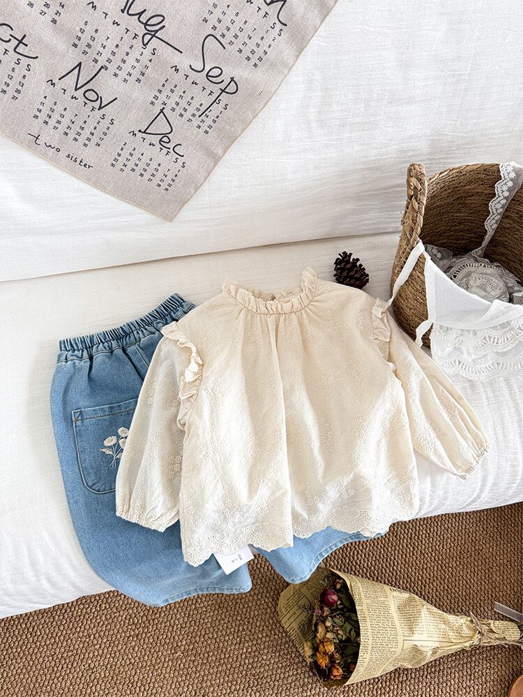 子供服 こどもふく おしゃれ お揃い オソロ リンク リンクコーデ 姉妹 姉妹コーデ かわいい プチプラ 女の子 アイボリー ホワイト 韓国子供服 韓国服 フリル 花柄 ブラウス シャツ トップス レース
